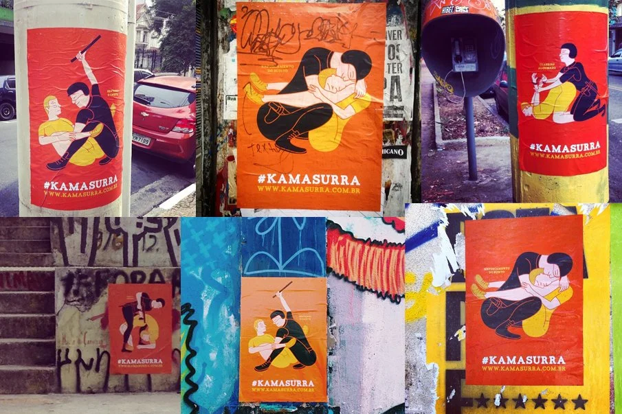A series of illustrated posters inspired by the original positions of the Kama Sutra, but instead of portraying couples making love, we see policemen spreading hate, while abusing protesters.